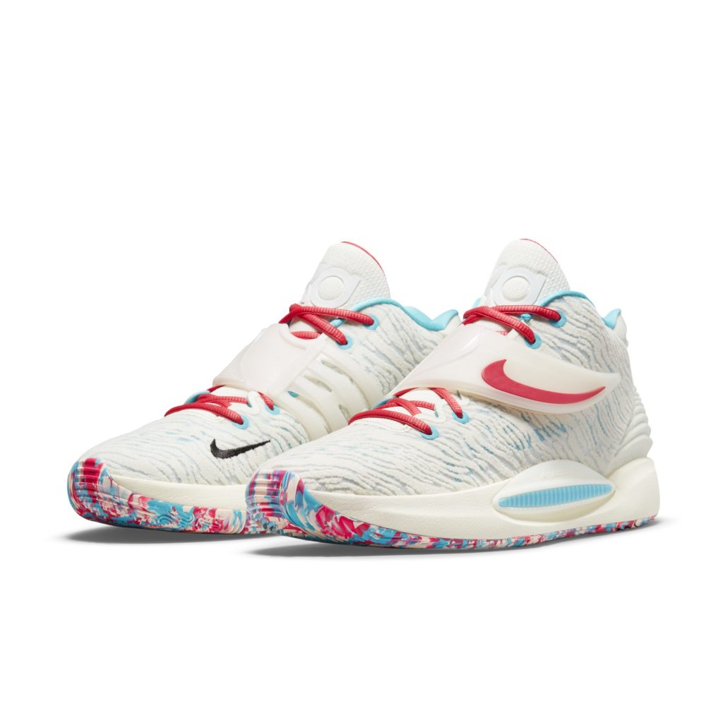 Kevin Durant schuilt langs de zijlijn, wachtend op het juiste moment om toe te slaan en zijn weg door de verdediging heen te snijden. De KD14 is ontworpen om veelzijdige, meedogenloze spelers zoals KD te helpen zodat ze zich de hele wedstrijd fris voelen. Mesh in meerdere lagen en een bandje bij de middenvoet zorgen ervoor dat je voet minder rondschuift in de schoen. Zoom Air demping over de hele lengte en Cushlon foam geven energie terug voor langdurige performance. Pasvorm zonder afleidingen, ingelopen gevoel Mesh met meerdere lagen in het bovenwerk is licht, heeft diepte en zorgt voor een ingedragen gevoel. Extra dikte in strategische zones houdt je voet op zijn plaats door kleine verschuivingen te verminderen. Stevig vast Een klittenbandsluiting loopt over de bovenkant van de veters voor ondersteuning en een aansluitende pasvorm. Het is een subtiele knipoog naar de band van de KD4 en is geïnspireerd op de vorm van de zeis van magere Hein. Ultieme responsieve ervaring De Air Zoom Strobel unit over de hele lengte is direct aan het bovenwerk gestikt. Dit helpt onnodig gewicht te verminderen en zorgt voor responsiviteit voor de hele voet. Cushlon foam zorgt voor een zacht, comfortabel gevoel. Precies de juiste grip Groeven en ribbels in de zool zorgen voor grip in meerdere richtingen en een goed contact met het veld. Een stijf stuk onder de voetholte zorgt ervoor dat de schoen stabiel blijft. Samen onthullen de schoenen de schedel van een gezicht.