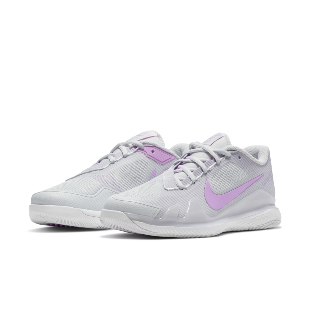 De NikeCourt Air Zoom Vapor Pro combineert alles wat je mooi vindt aan de NikeCourt Air Zoom Vapor X met een nog lichter gevoel en extra ondersteuning. Het design met drie lagen zorgt voor ventilatie, stabiliteit en stevigheid waar je die het hardst nodig hebt en is nog steeds ontzettend licht. Licht en ventilerend Stevige mesh houdt je voeten fris. De binnenkant van de mesh is versterkt waar je extra ondersteuning nodig hebt. De buitenkant heeft een dunne, flexibele overlay voor extra stevigheid. Gemaakt voor tennis Asymmetrische veters omsluiten je voet bij zijwaartse bewegingen. De veterpanden aan de binnenste zijkant zijn bij je tenen bedekt ter bescherming tegen slijtage door slides. Grip op basis van gegevens Voor de buitenzool is gebruikgemaakt van een design op basis van gegevens om optimale grip te creëren zonder dat je je vermogen om te sliden verliest. Rubber is verwijderd op plekken waar weinig slijtage optreedt om het gewicht laag te houden. Comfort op het veld De zachte middenzool van foam heeft een Zoom Air unit in de hak voor directe, responsieve demping. De elastische binnensleeve zit strak om je voet en voelt aan als een sok.
