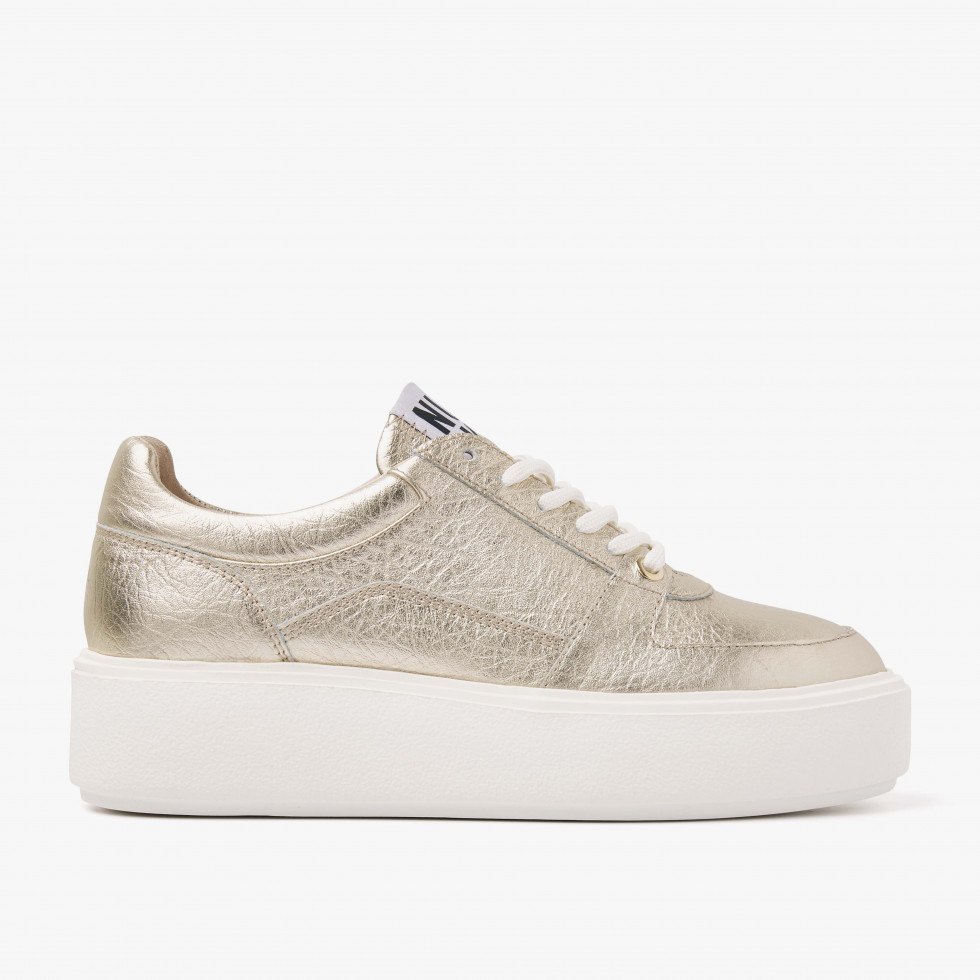 De Elise Joan gouden sneaker voor dames heeft een feminine top en is uitgerust met een toffe, lichtgewicht plateauzool. Dit item is zowel tof te combineren met cosy jurkjes als boyfriend outfits.  • Handgemaakt in Portugal • Hoogwaardig leer • Lichtgewicht zool